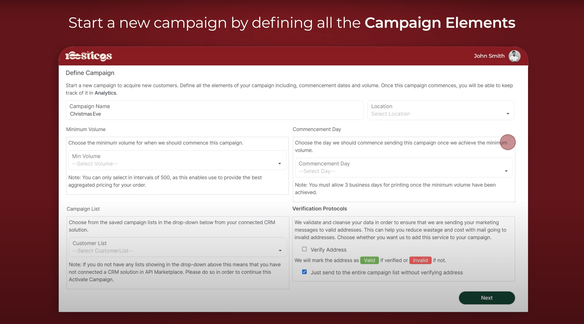 Set campaign commencement volume and the day a customer should receive direct mail.